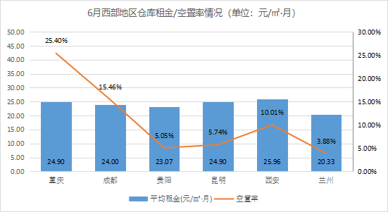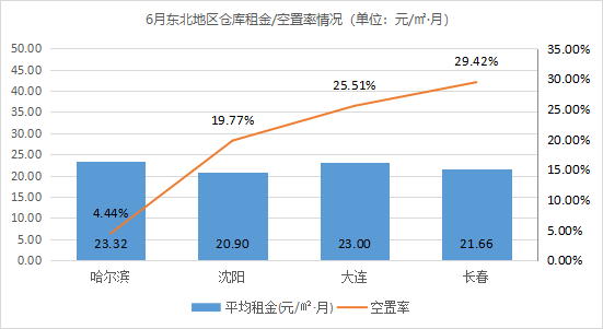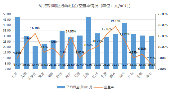 全国32个城市通用仓库平均租金为27.66元/㎡·月,环比上涨0.33%。其中,东部地区仓库平均租金(32.20元/㎡·月)高于西部(23.86元/㎡·月)、中部(22.96元/㎡·月)、东北(22.22元/㎡·月)地区。相较5月,中部地区仓库平均租金有所上涨,涨幅为1%;东部、中部、西部地区仓库平均租金相对稳定,增(降)幅±1%以内。