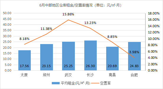 全国32个城市仓库空置率波动最大的城市是南昌,空置率环比下降4.63个百分点,6月南昌规模以上工业增加值增长10.9%,工业生产稳中向好,使得本月日化、五金等行业租赁需求旺盛,仓库去存化加速,使得仓库空置率有所下降。
