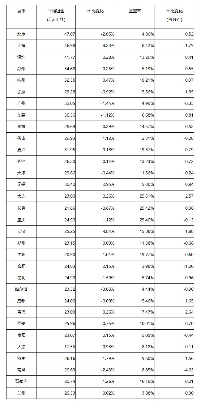 表:全国32个城市平均租金和空置率一览表