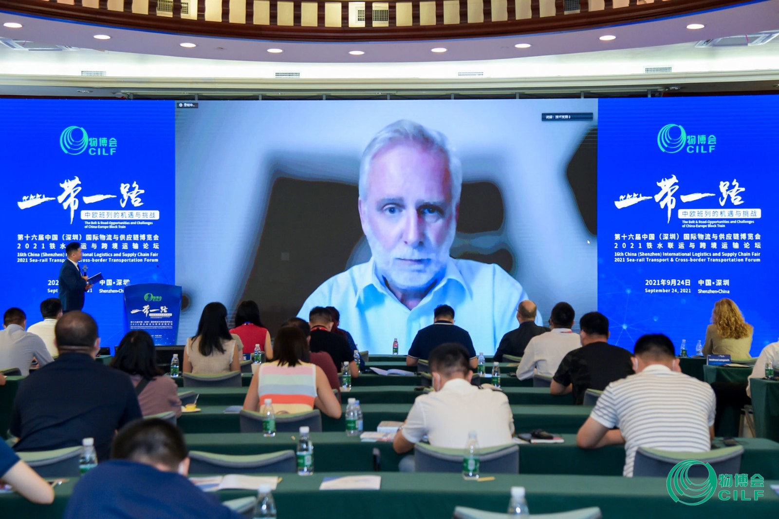 受疫情影响,UTLC公司总裁格罗姆·阿列克谢未能来到现场,他通过视频与现场观众介绍了UTLC在整个欧亚大陆运输背景下的定位。“行业需要长期的耕耘,才能保证整个欧亚大陆的运输是通畅的,今天能够加入到国际运输走廊,能够保证所有的参与者尤其是欧亚运输的参与者,能够通过陆上以及海上交通运输的整个运力的扩展,进一步实现合作。”格罗姆·阿列克谢说道。