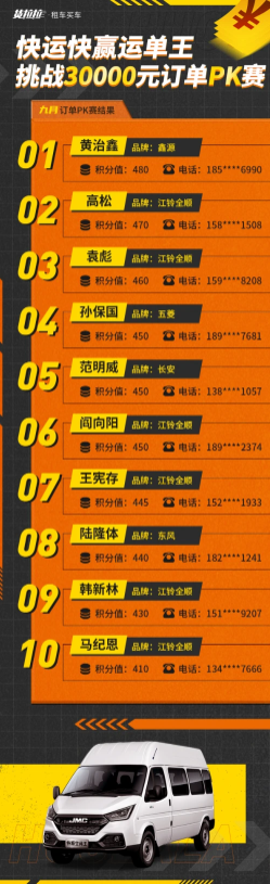 这场席卷全国的物流标杆竞技赛,有全国江铃福特经销商举办的线下活动,吸引了众多江铃福特轻客车主参加,并已成功角逐出60位排位赛冠军,他们获得了“特顺空间王首席体验官”的荣誉称号。而在货拉拉平台也同步举办了线上活动,吸引超过10万平台车主密切关注比赛,其中有超过6400位各商用车品牌车主亲身报名参赛,如今前10名的货拉拉“快运快赢运单王”已经应运而生。