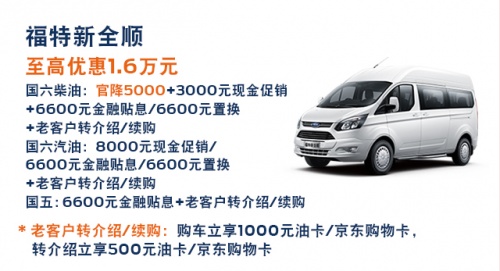 江铃福特敢对新全顺商旅型的动力总成做出终身质保服务承诺,一是对自身产品的自信,二是希望这项承诺能够成为车主在用车过程中的坚强后盾。此外,即日起至11月30日期间,购买福特新全顺国六柴油版,可享受5000元官降优惠,还可叠加多重优惠,至高可享1.6万元,助力用户一路全顺,创富创赢,奔向幸福。