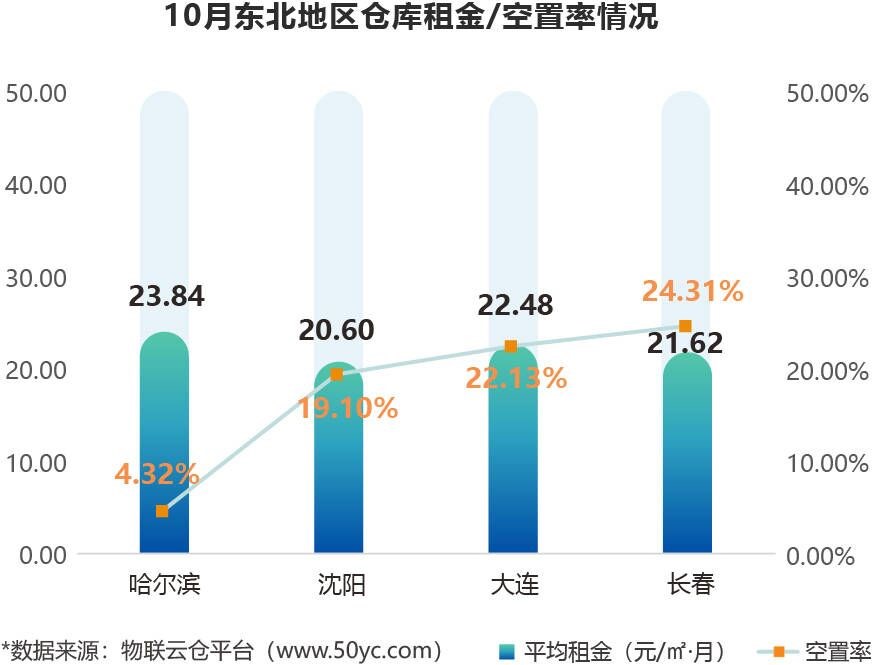 全国32个城市仓库平均空置率为12.12%,环比上升0.38%。其中,东北地区空置率(17.46%)远高于中部(13.55%)、西部(12.28%)、东部(10.81%)地区。相较9月,中部地区空置率有所上升,升幅为2.40个百分点;东北、东部、西部地区空置率均相对稳定,升(降)幅变化在±1个百分点以内。
