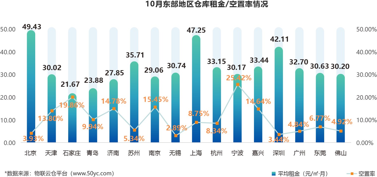 全国32个城市通用仓库平均租金为28.13元/㎡·月,环比上涨0.39%。其中,东部地区仓库平均租金(33.00元/㎡·月)高于西部(24.02元/㎡·月)、中部(23.26元/㎡·月)、东北(22.14元/㎡·月)地区。相较9月,四个地区平均租金相对稳定,增(降)幅±1%以内。