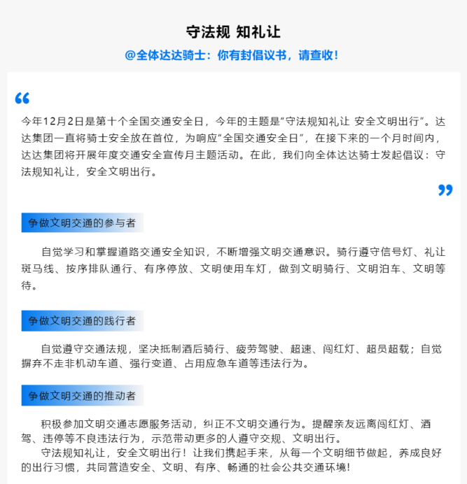 今年12月2日是第十个“全国交通安全日”。达达集团一直将骑士安全配送放在首位,为响应“全国交通安全日”,本月,达达集团联合北京、上海、杭州、无锡、深圳、成都、南昌、福州等多地交管部门,围绕“守法规知礼让 安全文明出行”为主题开展宣传月活动。