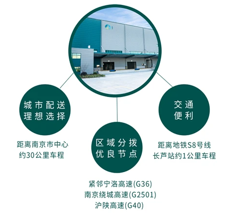 南京*经济开发区扼南北交通要冲,是省政府“苏南板块”及市政府“江北工业城”重要基点。安博南京*物流中心建造于此,其紧邻宁洛高速(G36)、南京绕城高速(G2501)、沪陕高速(G40),辐射地区广泛,毗邻南京市区,距市中心车程约30公里,距地铁S8号线长芦站车程约1公里车程,交通便利,大大解决物流配送时效问题,是区域配送的理想选择。