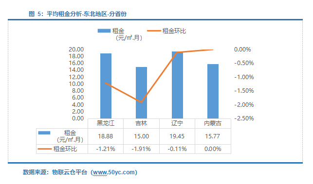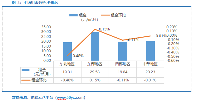 平均租金最高地区为东部地区,29.58元/㎡·月,环比涨幅0.15%;平均租金最低地区为东北地区,19.31元/㎡·月,环比下降0.48%。