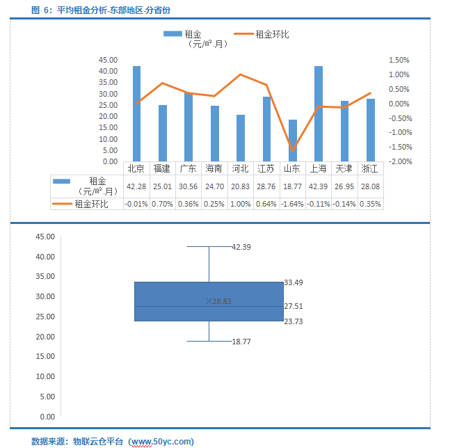 东部省份租金中位值27.51元/㎡·月,平均租金区间范围23.73-33.49元/㎡·月;其中上海平均租金最高为42.39元/㎡·月,山东平均租金最低为18.77元/㎡·月。河北平均租金环比涨幅最大为1.00%,山东平均租金环比跌幅最大为1.64%。