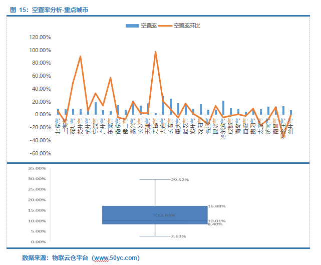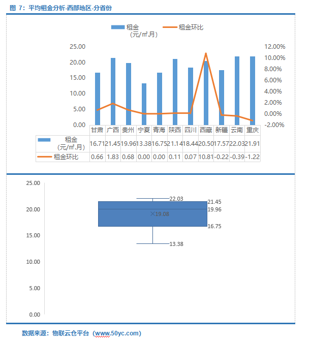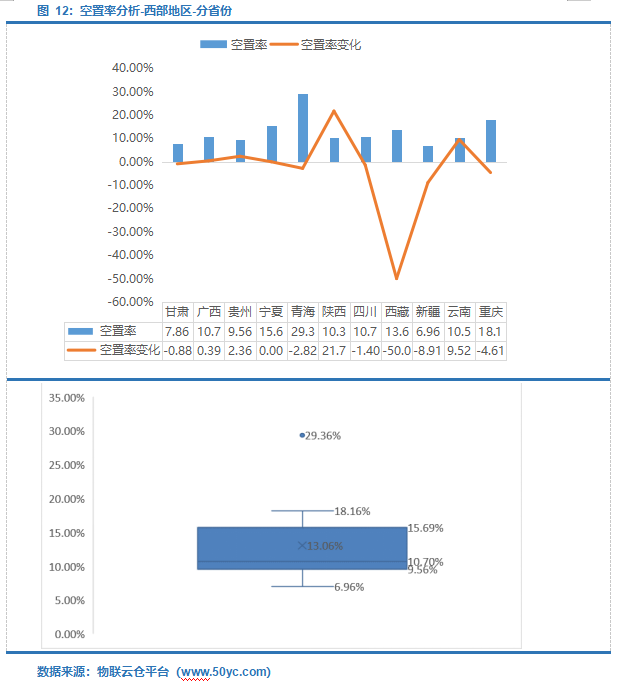 西部地区空置率中位值10.70%,区间9.56%-15.69%;其中青海空置率最高为29.36%,新疆空置率最低为6.96%。陕西空置率环比涨幅最大为21.71%,主要原因为受疫情影响,一方面生鲜电商等仓储需求量下降,另一方面部分企业自建仓储减少外界租仓需求;西藏空置率环比跌幅最大为50.00%。