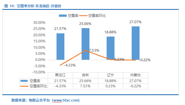 内蒙古空置率最高,数值为27.07%;辽宁空置率最低,数值为18.88%。吉林空置率环比涨幅最大,数值为7.53%;黑龙江空置率环比下降4.33%,降幅最大。