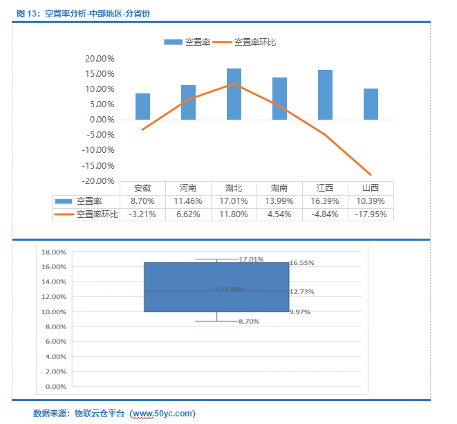 中部地区空置率中位值12.73%,区间9.97%-16.55%;其中湖北空置率最高为17.01%,安徽空置率最低为8.70%。湖北受仓库新增供应入市,现有仓储招商不足,使得空置率环比涨幅最大为11.80%;山西空置率环比跌幅最大为17.95%。