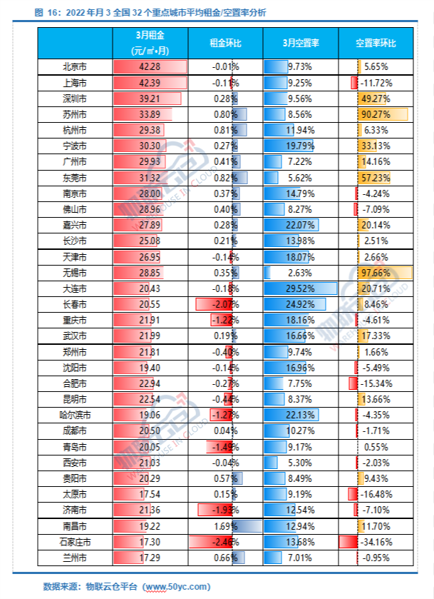 在中国仓储与配送协会指导下,物联云仓《中国通用仓储市场动态报告》已连续发布44期。《报告》通过对物联云仓实时数据进行汇总、整理,全面反映我国32个主要物流节点城市的仓储设施平均租金水平和空置情况,体现通用仓储市场的供需动态变化,总结市场发展规律,预测市场发展趋势,为了解仓储市场发展情况、合理投资提供参考依据。