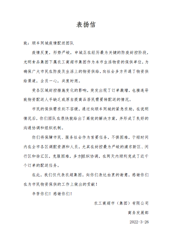 “你们将保障市民、服务社会作为首要任务,不惧困难,于短时间内在全市各区调配资源和人员,尤其在封控最为严峻的浦东新区、闵行区和徐汇区,克服困难,多方组织协调,在两天内顺利完成了近千个订单的配送任务。”这是来自农工商超市集团给顺丰同城表扬信中的一段话。