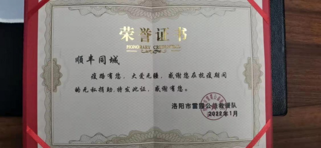 22年初,西安疫情严重时,洛阳市顺丰同城积极响应洛阳市雷霆公益救援队的公益之举,在得知洛阳雷霆救援队将要前往西安运送爱心物资消息,立即发动顺丰同城的骑士采购物资支援并协助救援队员装车,事后洛阳市雷霆公益救援队特发来荣誉证书,感谢顺丰同城在疫情期间做的努力。