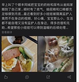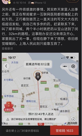也有一些宝妈在社交平台感谢骑士为小孩紧急配送奶粉等婴儿生活必须品,也有母亲因疫情期间营养补充不足导致母乳不足,顺丰同城骑士紧急配送的生活物资使自己营养得到补充,使刚出生11天的宝宝不至于断奶。