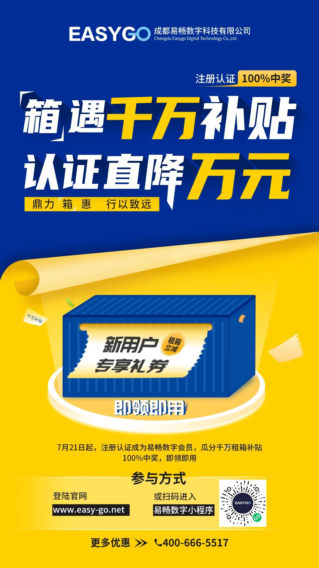 7月21日起,注册认证成为易畅数字会员企业,可获得最高价值万元的租箱礼券,优选福利尽在你手!