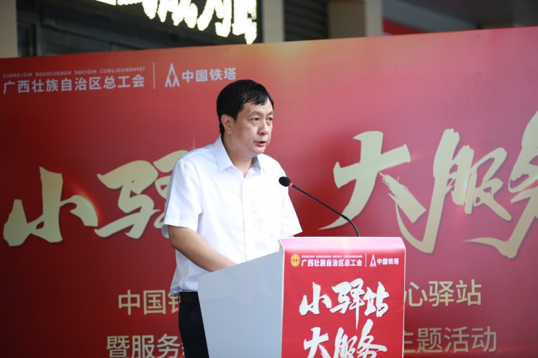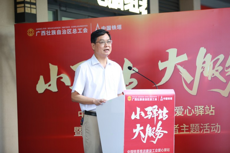 为深入贯彻落实习总书记关于新业态劳动者系列重要指示批示精神,扎实推进“我为群众办实事”实践活动,以实际行动迎接党的二十大胜利召开,2025年8月8日上午,广西壮族自治区总工会(以下简称自治区总工会)、中国铁塔股份有限公司广西壮族自治区分公司(以下简称广西铁塔)在南宁、桂林、柳州、贵港、钦州五市同步举行“小驿站,大服务——中国铁塔推进建设工会爱心驿站暨服务新就业形态劳动者”主题活动。自治区总工会党组成员、副主席黄林毅,中国铁塔广西分公司党委委员、副总经理卢绍英等领导在南宁市出席活动。