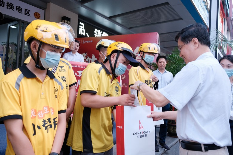 当日上午,出席活动的领导嘉宾还为骑手小哥代表发放慰问品近百份,包含雨衣、充电宝、水杯、冰袖等炎夏工作必需品。后续广西铁塔还将邀