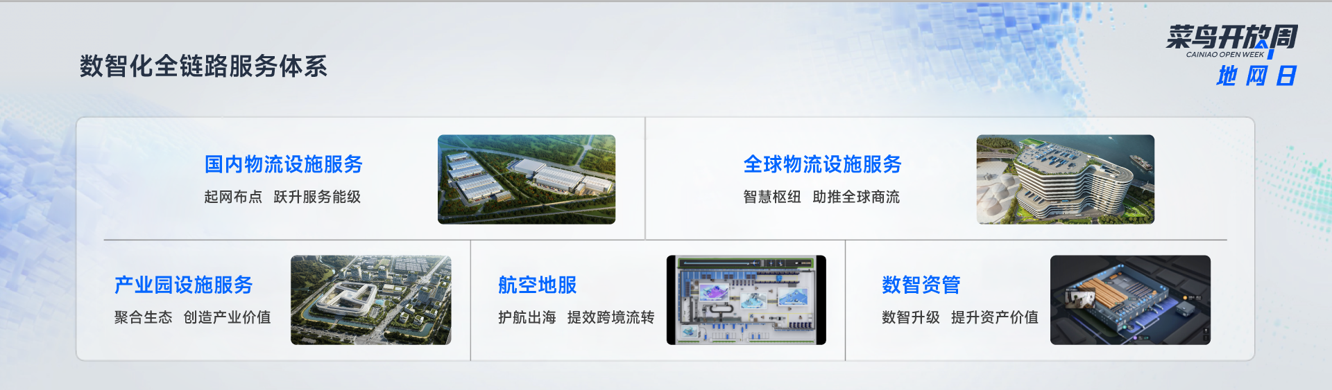 在7月25日启动的2025菜鸟开放周上,菜鸟地网发布的最新业务大图显示,通过国内物流设施服务、全球物流设施服务、产业园设施服务、航空地服、数智资管五大业务板块,菜鸟地网已形成了投、建、招、管、服的全方位服务能力,将构建数智化全链路服务体系,为全球合作伙伴提供一站式的数智化服务体验。