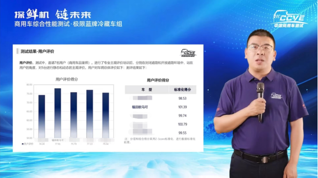 在用户评价测试中,7名进行了专业主观评价培训,参与封闭道路和开放道路测试的品鉴师,站在用户的角度,对参与评测的5台极限蓝牌冷藏车进行静态和动态的主观评价。最终,全新一代欧马可S1冷藏车产品101.39的优异成绩,斩获第一,成为最受品鉴师喜爱和信赖的极限蓝牌冷藏车。