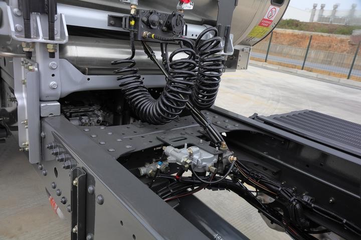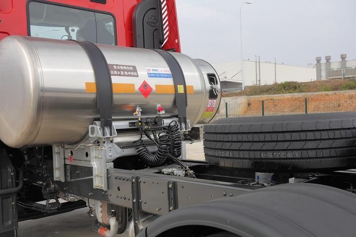 我们实拍的这台车就装配了1000L的储气罐,续航能力最大达2000公里以上,强悍的续航能力可以轻松满足长途干线物流运输工况的使用需求。