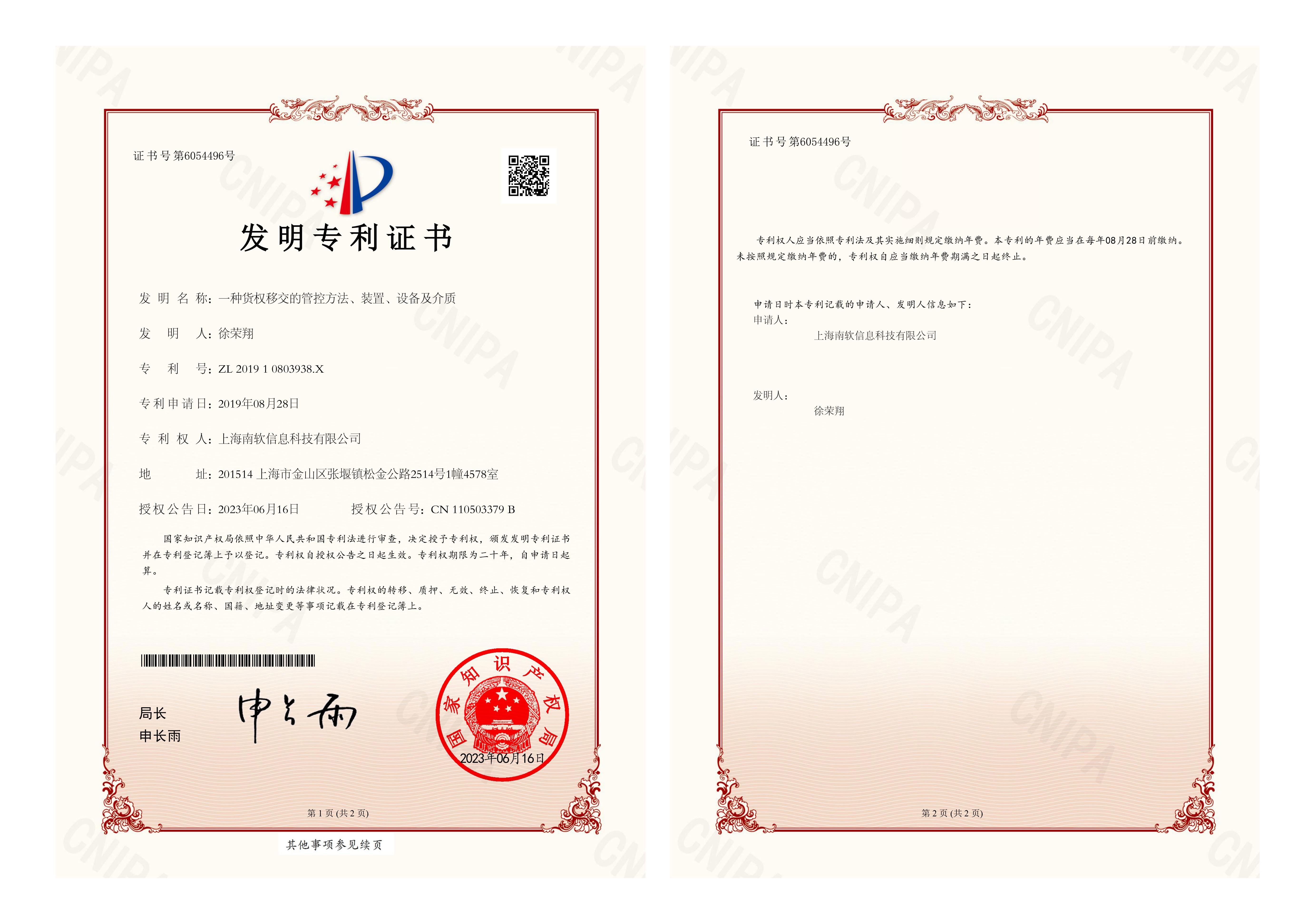 近期,上海南软信息科技有限公司(品牌“物流源”)获得了国家知识产权局颁发的一项发明专利证书(专利号ZL201910803938.X),专利名称为“一种货权移交的管控方法、装置、设备及介质”,专利成果主要应用于物流运输领域。