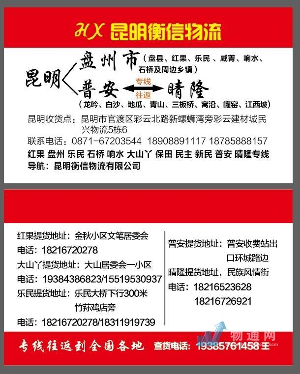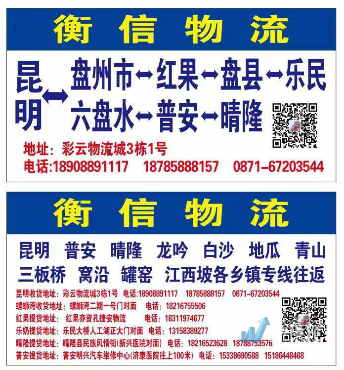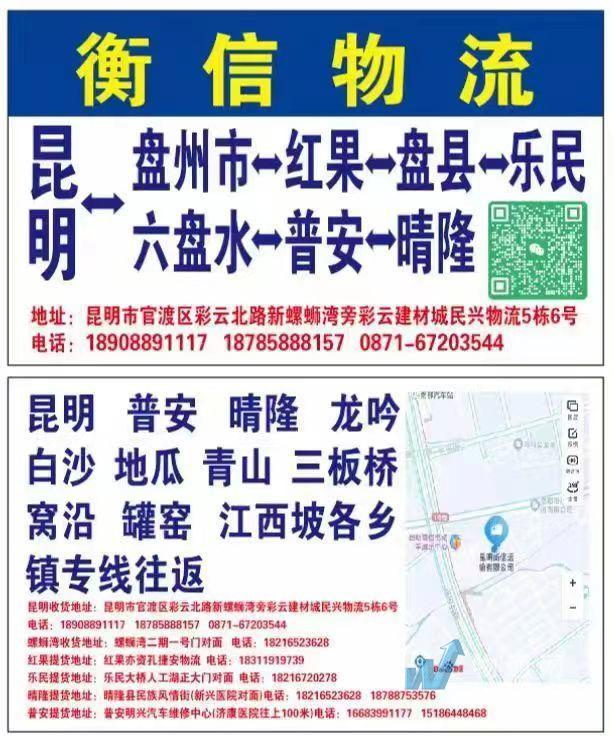 衡信物流昆明至盘州→红果→两河→乐民→响水→石桥→威箐专线及周边各乡镇专车往返。衡信物流国际线路:昆明—老挝(老街)