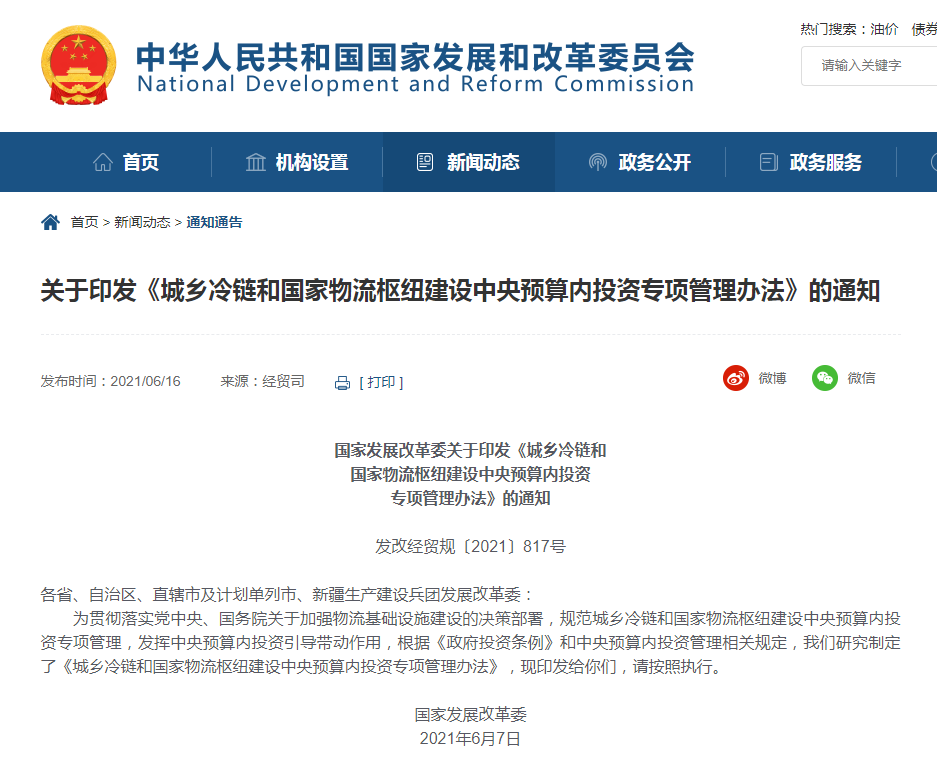 6月16日消息,从国家发改委网站获悉,日前发改委印发《城乡冷链和国家物流枢纽建设中央预算内投